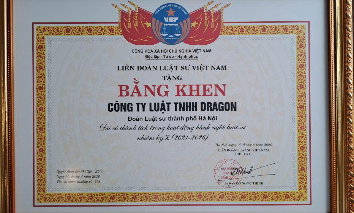 Với những thành tích đã đạt được, Công ty Luật Dragon đã được Liên đoàn Luật sư Việt Nam trao tặng Bằng khen tại Đại hội XI Đoàn Luật sư TP. Hà Nội. Đây là sự ghi nhận xứng đáng cho những nỗ lực, cố gắng của tập thể luật sư, chuyên gia pháp lý của công ty, đồng thời là động lực để Công ty Luật Dragon tiếp tục phát triển, đóng góp nhiều hơn nữa cho sự nghiệp xây dựng và bảo vệ pháp luật.